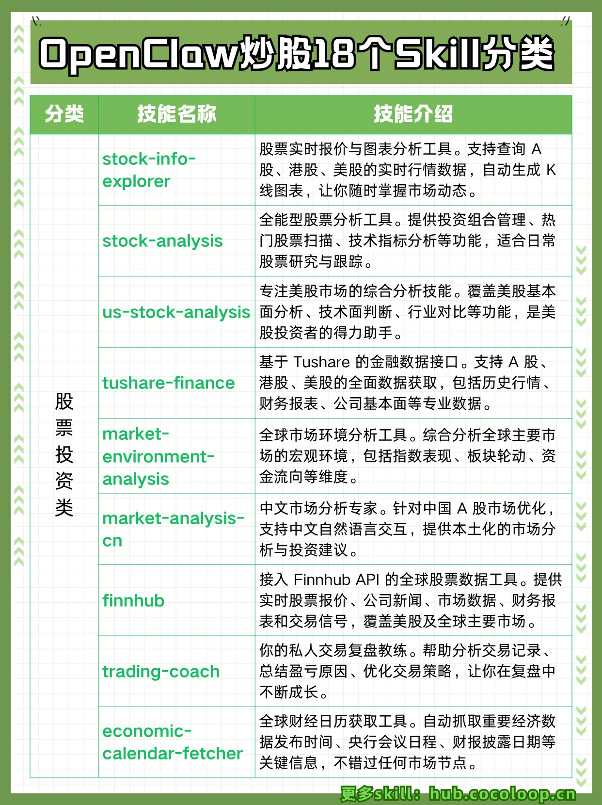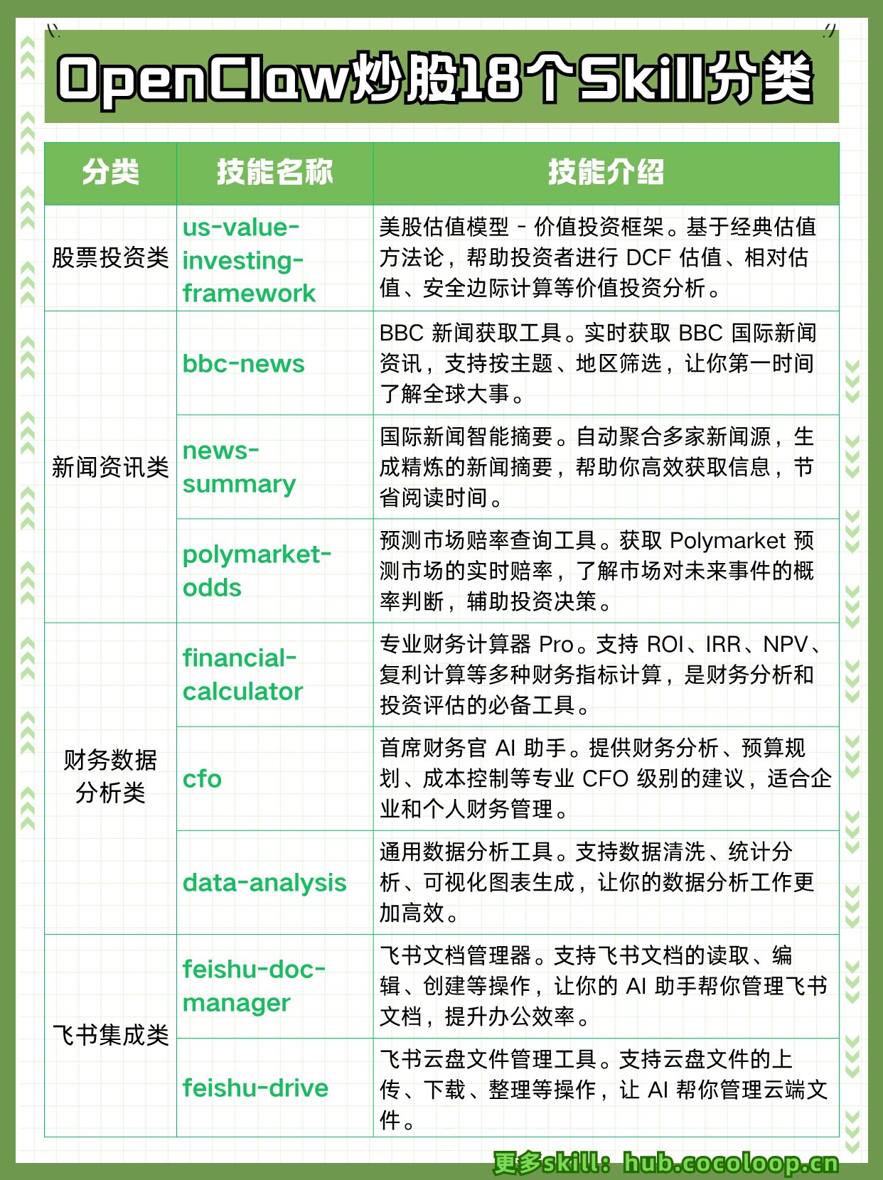 本文结合 Cocoloop 社区实测推荐,从股票投资、新闻资讯、财务数据分析、飞书集成四大维度,拆解 18 个炒股必备 Skill,附核心功能与使用场景,文末附技能获取渠道,帮你一站式搭建 AI 炒股生态。